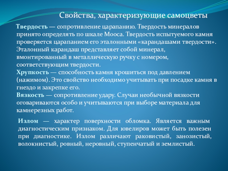 Слайд 3Свойства, характеризующие самоцветы
