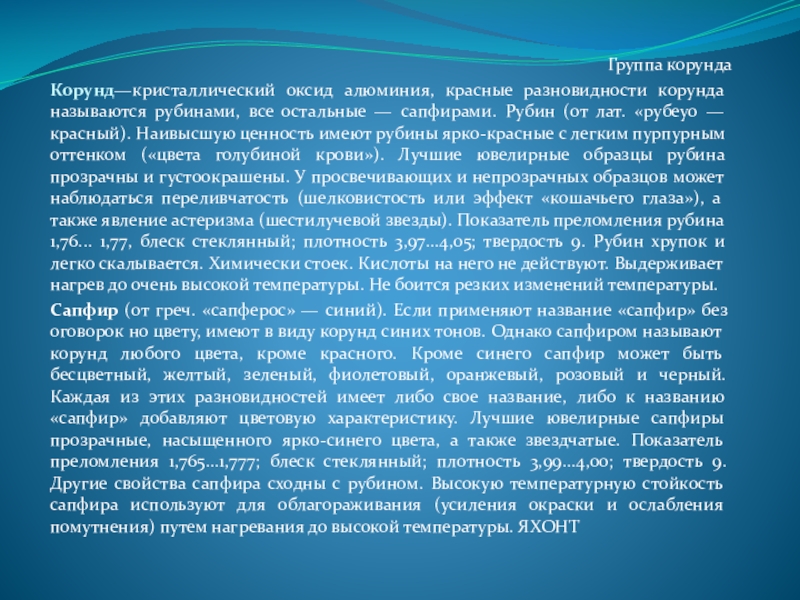 Сапфир (от греч. «сапферос» — синий). Если применяют название «сапфир» без оговорок но цвету, имеют в виду корунд синих тонов. Однако сапфиром называют корунд любого цвета, кроме красного. Кроме синего сапфир может быть бесцветный, желтый, зеленый, фиолетовый, оранжевый, розовый и черный. Каждая из этих разновидностей имеет либо свое название, либо к названию «сапфир» добавляют цветовую характеристику. Лучшие ювелирные сапфиры прозрачные, насыщенного ярко-синего цвета, а также звездчатые. Показатель преломления 1,765...1,777; блеск стеклянный; плотность 3,99...4,00; твердость 9. Другие свойства сапфира сходны с рубином. Высокую температурную стойкость сапфира используют для облагораживания (усиления окраски и ослабления помутнения) путем нагревания до высокой температуры. ЯХОНТ