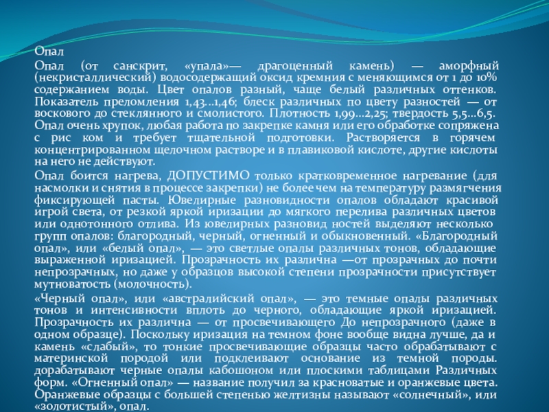 Опал боится нагрева, ДОПУСТИМО только кратковременное нагревание (для насмолки и снятия в процессе закрепки) не более чем на температуру размягчения фиксирующей пасты. Ювелирные разновидности опалов обладают красивой игрой света, от резкой яркой иризации до мягкого перелива различных цветов или однотонного отлива. Из ювелирных разновид ностей выделяют несколько групп опалов: благородный, черный, огненный и обыкновенный. «Благородный опал», или «белый опал», — это светлые опалы различных тонов, обладающие выраженной иризацией. Прозрачность их различна —от прозрачных до почти непрозрачных, но даже у образцов высокой степени прозрачности присутствует мутноватость (молочность).