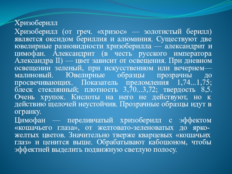 и алюминия. Существуют две ювелирные разновидности хризоберилла — александрит и цимофан. Александрит (в честь русского императора Александра II) — цвет зависит от освещения. При дневном освещении зеленый, при искусственном или вечернем—малиновый. Ювелирные образцы прозрачны до просвечивающих. Показатель преломления 1,74...1,75; блеск стеклянный; плотность 3,70...3,72; твердость 8,5. Очень хрупок. Кислоты на него не действуют, но к действию щелочей неустойчив. Прозрачные образцы идут в огранку.