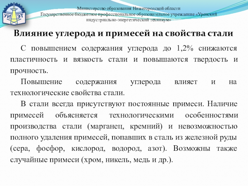 С повышением содержания углерода до 1,2% снижаются пластичность и вязкость стали и повышаются твердость и прочность.
