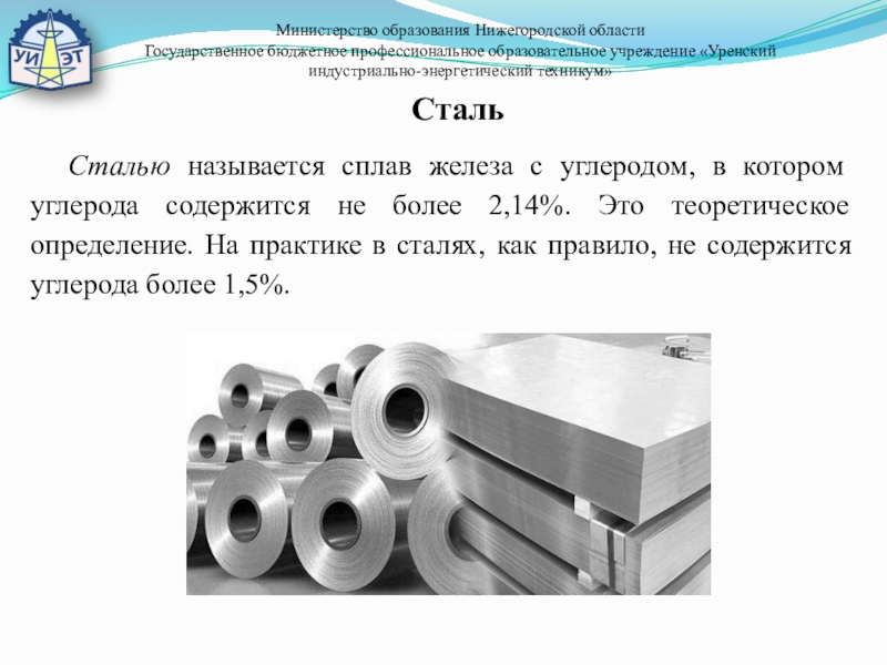 Сталью называется сплав железа с углеродом, в котором углерода содержится не более 2,14%. Это теоретическое определение. На практике в сталях, как правило, не содержится углерода более 1,5%.
