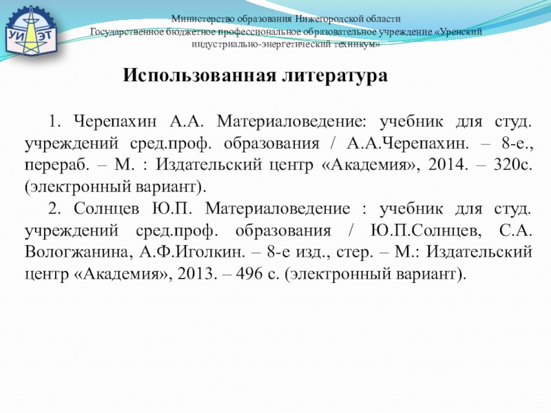 1. Черепахин А.А. Материаловедение: учебник для студ. учреждений сред.проф. образования / А.А.Черепахин. – 8-е., перераб. – М. : Издательский центр «Академия», 2014. – 320с. (электронный вариант).