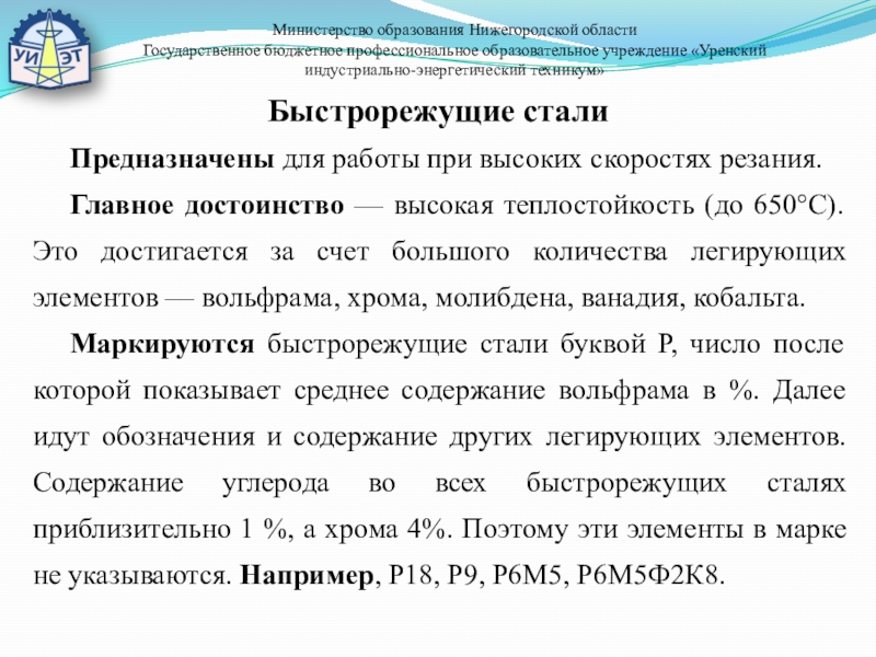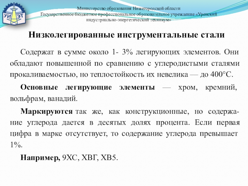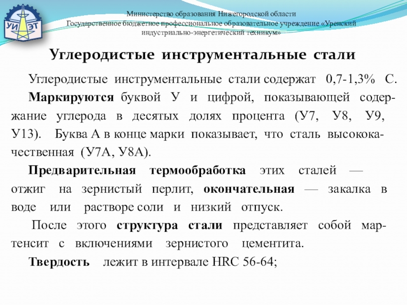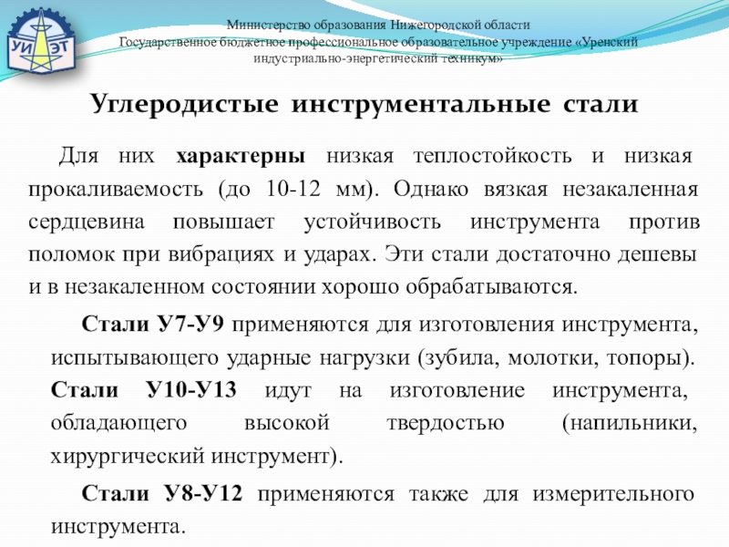 Маркируются буквой У и цифрой, показывающей содер-жание углерода в десятых долях процента (У7, У8, У9, У13). Буква А в конце марки показывает, что сталь высокока-чественная (У7А, У8А).