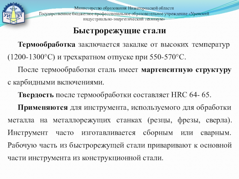 Предварительная термообработка этих сталей — отжиг на зернистый перлит, окончательная — закалка в воде или растворе соли и низкий отпуск.