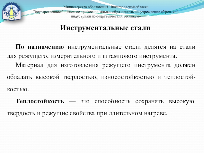По назначению инструментальные стали делятся на стали для режущего, измерительного и штампового инструмента.