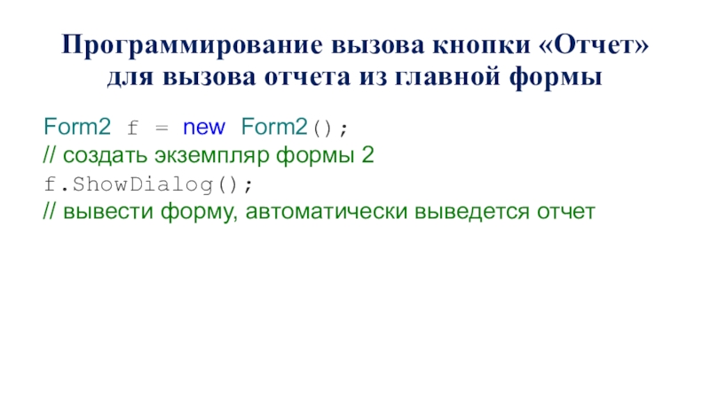 Слайд 22Программирование вызова кнопки «Отчет» для вызова отчета из главной формы