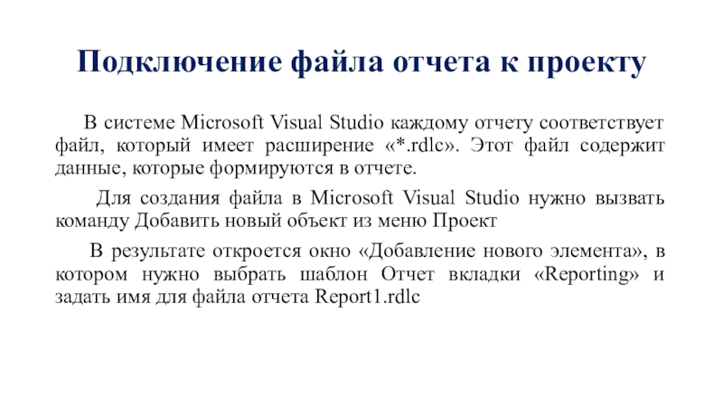 Studio каждому отчету соответствует файл, который имеет расширение «*.rdlc». Этот файл содержит данные, которые формируются в отчете.