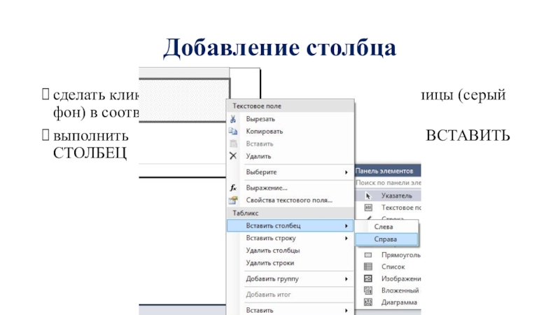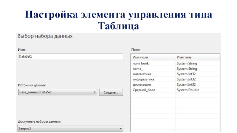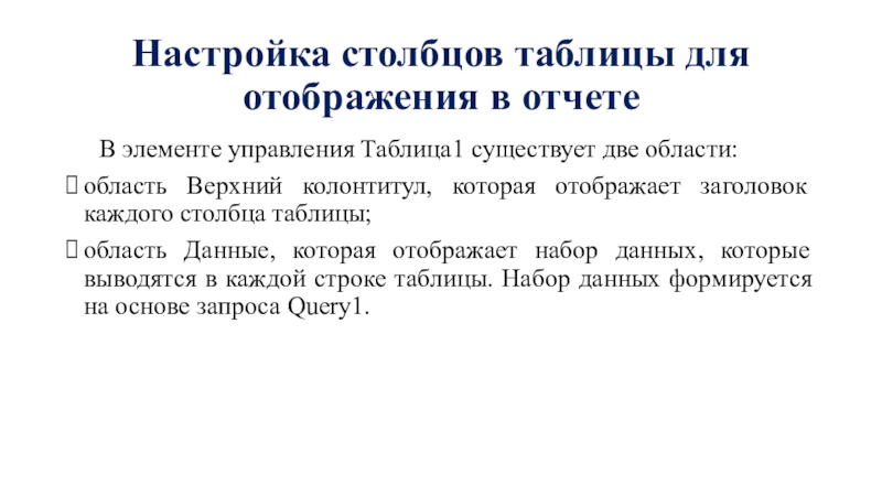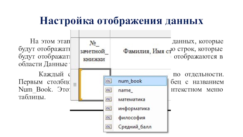 Слайд 13Настройка столбцов таблицы для отображения в отчете