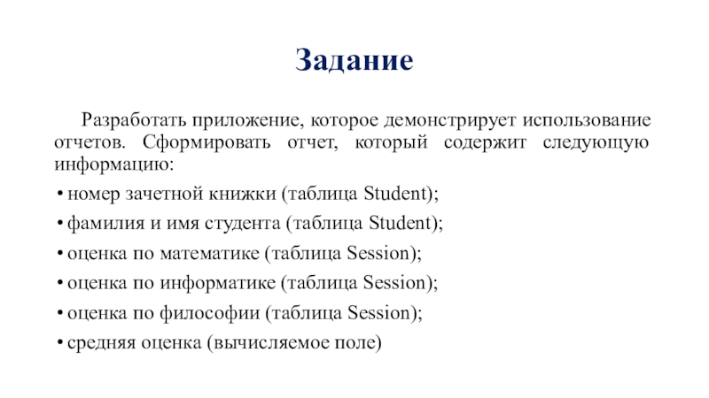Разработать приложение, которое демонстрирует использование отчетов. Сформировать отчет,