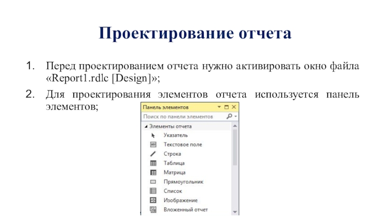 Перед проектированием отчета нужно активировать окно файла «Report1.rdlc [Design]»;