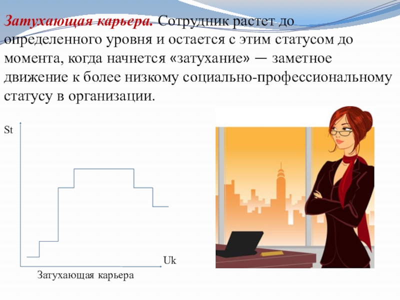 Слайд 12Затухающая карьера. Сотрудник растет до определенного уровня и остается с этим