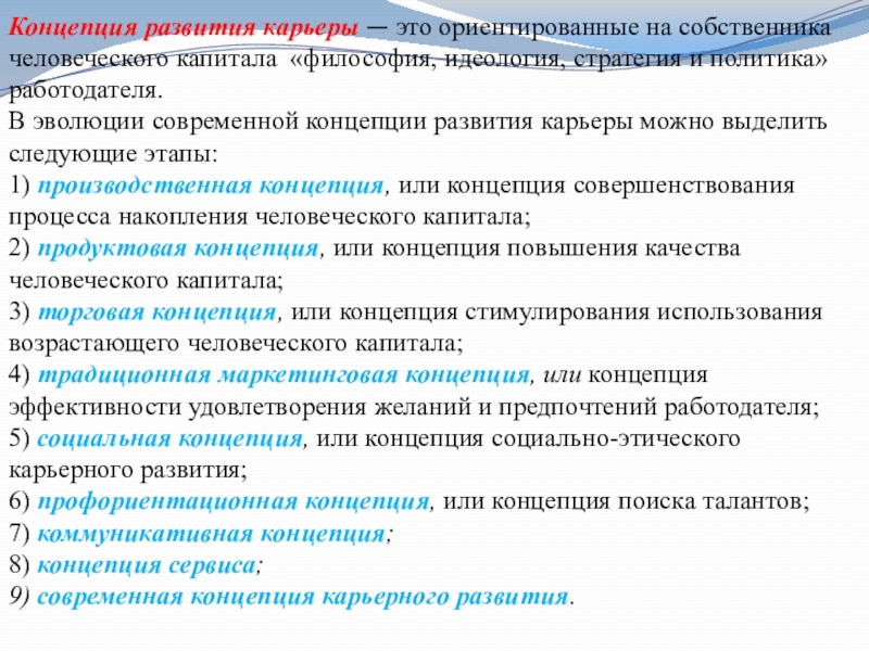 Слайд 17Концепция развития карьеры — это ориентированные на собственника человеческого капитала «философия,