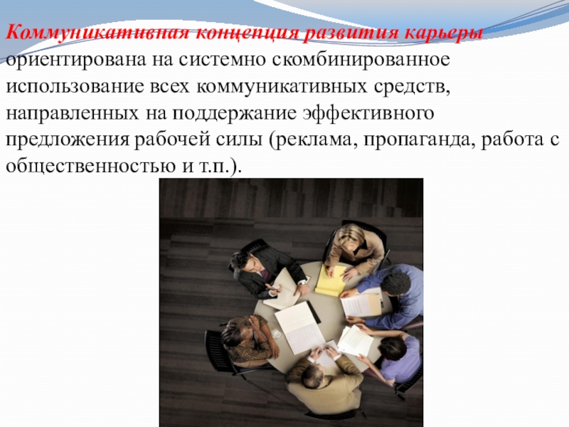 Слайд 30Коммуникативная концепция развития карьеры ориентирована на системно скомбинированное использование всех коммуникативных