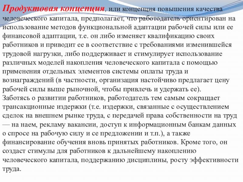 Слайд 20Продуктовая концепция, или концепция повышения качества человеческого капитала, предполагает, что работодатель