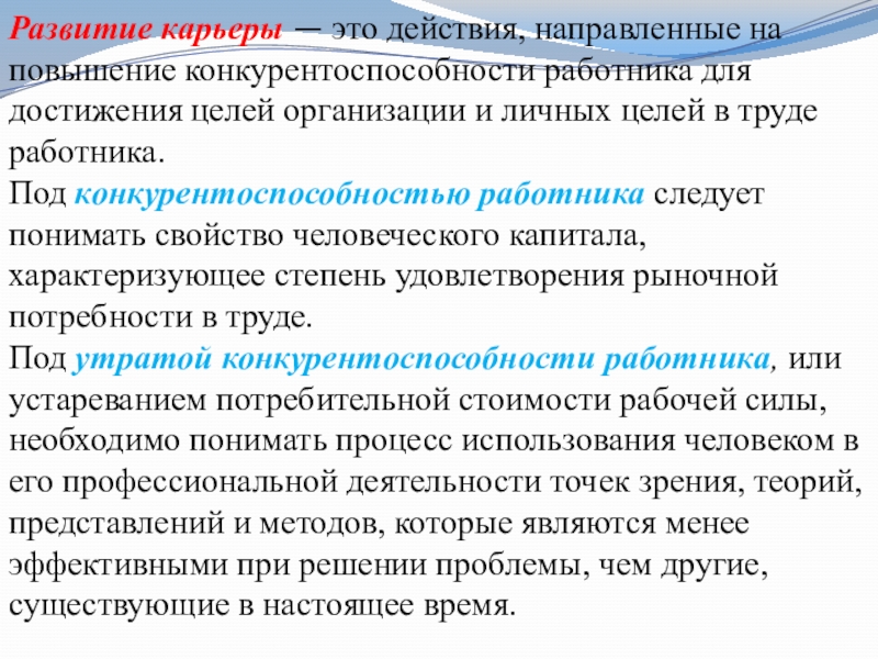 Слайд 13Развитие карьеры — это действия, направленные на повышение конкурентоспособности работника для