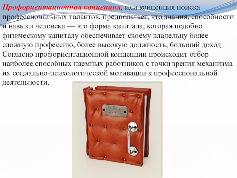 и навыки человека — это форма капитала, которая подобно физическому капиталу обеспечивает своему владельцу более сложную профессию, более высокую должность, больший доход.. Согласно профориентационной концепции происходит отбор наиболее способных наемных работников с точки зрения механизма их социально-психологической мотивации к профессиональной деятельности.