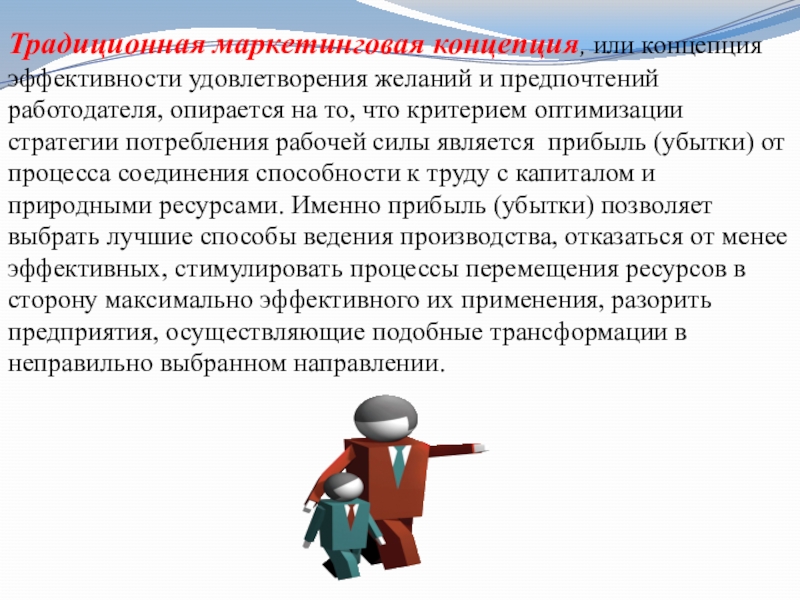 Слайд 24Традиционная маркетинговая концепция, или концепция эффективности удовлетворения желаний и предпочтений работодателя,