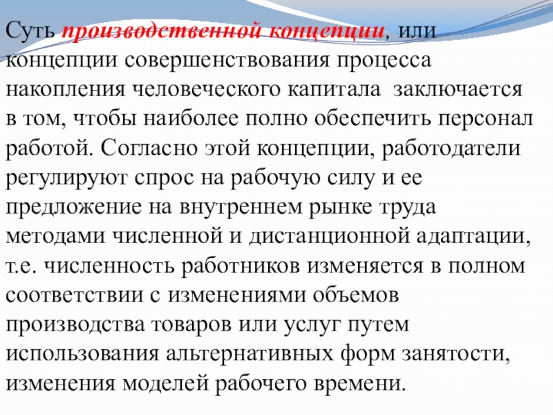 в том, чтобы наиболее полно обеспечить персонал работой. Согласно этой концепции, работодатели регулируют спрос на рабочую силу и ее предложение на внутреннем рынке труда методами численной и дистанционной адаптации, т.е. численность работников изменяется в полном соответствии с изменениями объемов производства товаров или услуг путем использования альтернативных форм занятости, изменения моделей рабочего времени.