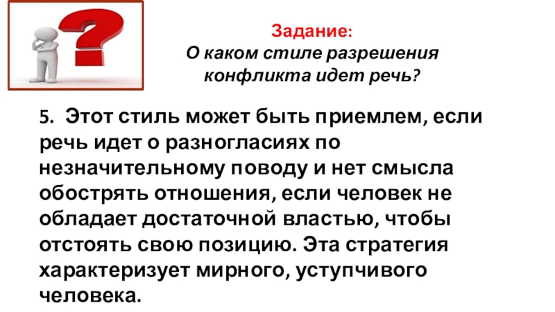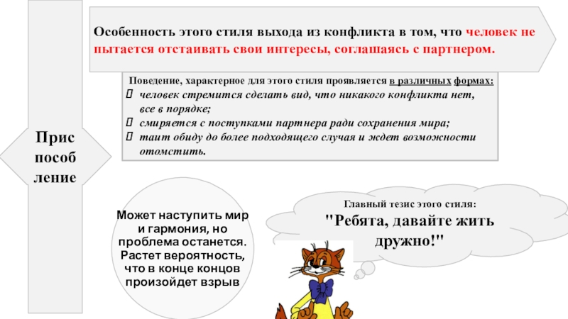 Особенность этого стиля выхода из конфликта в том, что человек не пытается отстаивать свои интересы, соглашаясь с партнером.