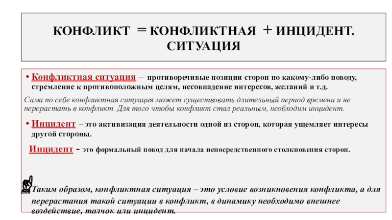 Сама по себе конфликтная ситуация может существовать длительный период времени и не перерастать в конфликт. Для того чтобы конфликт стал реальным, необходим инцидент.