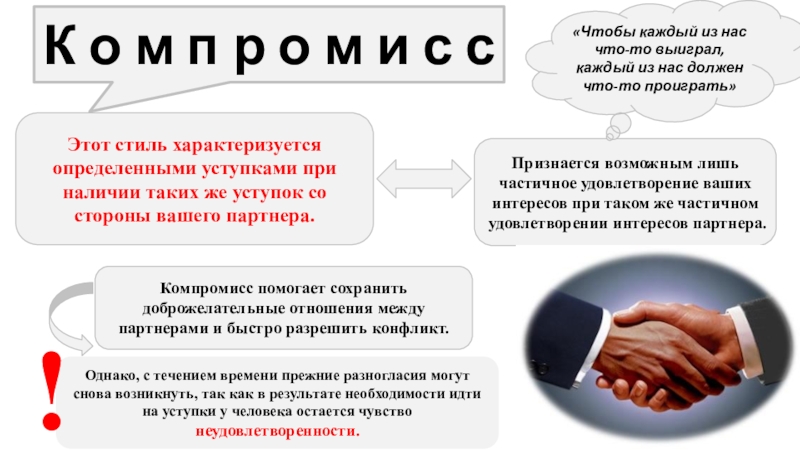 Компромисс помогает сохранить доброжелательные отношения между партнерами и быстро разрешить конфликт.