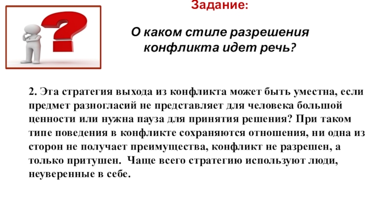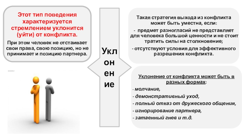 из конфликта может быть уместна, если предмет разногласий не представляет для человека большой ценности или нужна пауза для принятия решения? При таком типе поведения в конфликте сохраняются отношения, ни одна из сторон не получает преимущества, конфликт не разрешен, а только притушен. Чаще всего стратегию используют люди, неуверенные в себе.