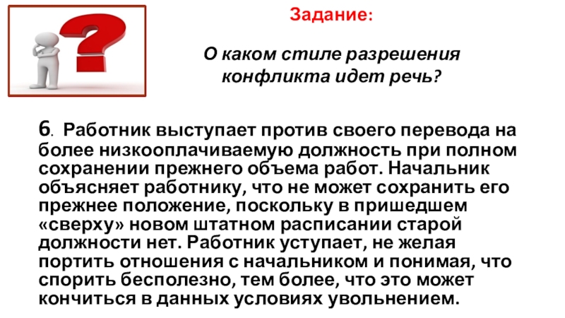 против своего перевода на более низкооплачиваемую должность при полном сохранении прежнего объема работ. Начальник объясняет работнику, что не может сохранить его прежнее положение, поскольку в пришедшем «сверху» новом штатном расписании старой должности нет. Работник уступает, не желая портить отношения с начальником и понимая, что спорить бесполезно, тем более, что это может кончиться в данных условиях увольнением.