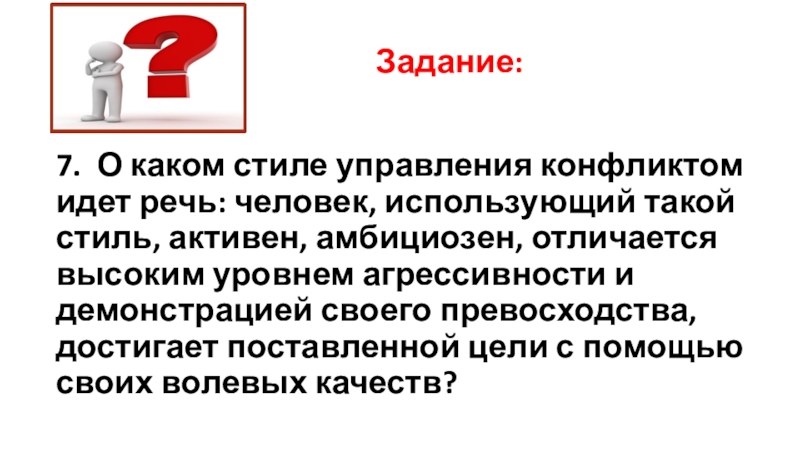 7. О каком стиле управления конфликтом идет речь: человек, использующий