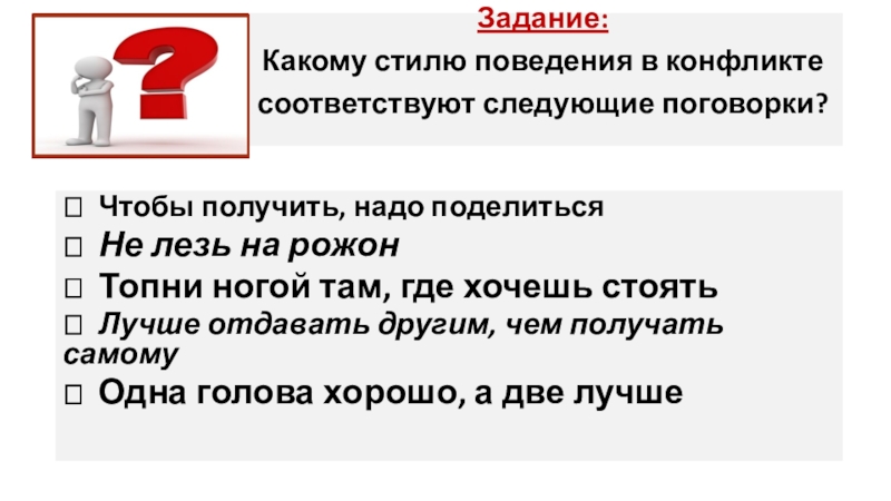 Какому стилю поведения в конфликте соответствуют следующие поговорки?