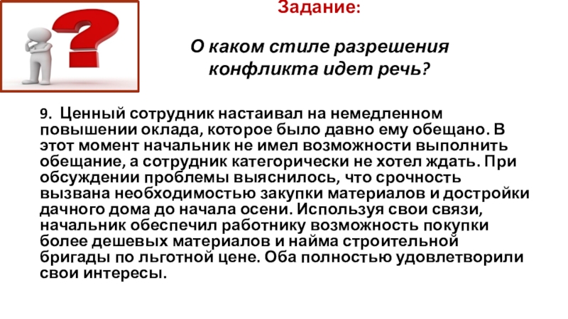 на немедленном повышении оклада, которое было давно ему обещано. В этот момент начальник не имел возможности выполнить обещание, а сотрудник категорически не хотел ждать. При обсуждении проблемы выяснилось, что срочность вызвана необходимостью закупки материалов и достройки дачного дома до начала осени. Используя свои связи, начальник обеспечил работнику возможность покупки более дешевых материалов и найма строительной бригады по льготной цене. Оба полностью удовлетворили свои интересы.