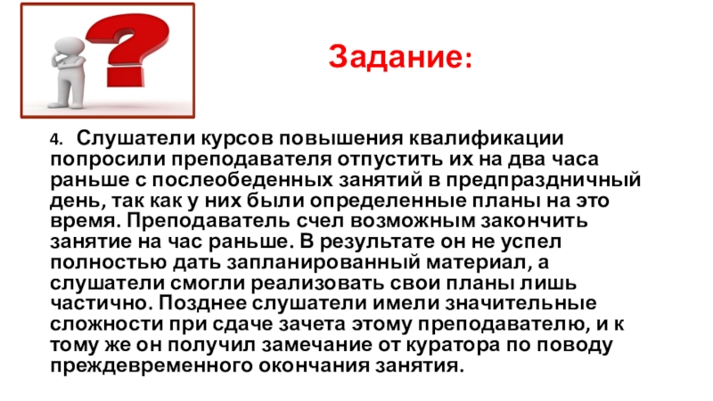 часа раньше с послеобеденных занятий в предпраздничный день, так как у них были определенные планы на это время. Преподаватель счел возможным закончить занятие на час раньше. В результате он не успел полностью дать запланированный материал, а слушатели смогли реализовать свои планы лишь частично. Позднее слушатели имели значительные сложности при сдаче зачета этому преподавателю, и к тому же он получил замечание от куратора по поводу преждевременного окончания занятия.
