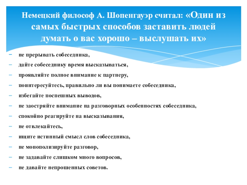 Немецкий философ А. Шопенгауэр считал: «Один из самых быстрых способов заставить людей думать о вас хорошо – выслушать их»