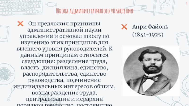 школу по изучению этих принципов для высшего уровня руководителей. К данным принципам относятся следующие: разделение труда, власть, дисциплина, единство, распорядительства, единство руководства, подчинение индивидуальных интересов общим, вознаграждение труда, централизация и иерархия порядков равенство, постоянство состава, инициатива, честь.