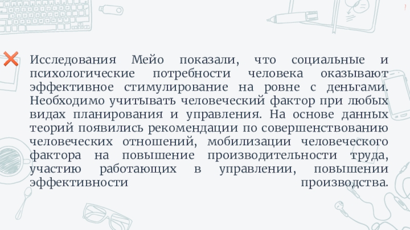 Слайд 7Исследования Мейо показали, что социальные и психологические потребности человека оказывают эффективное