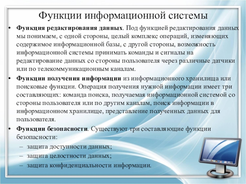 Функции получения информации из информационного хранилища или поисковые функции. Операция получения нужной информации имеет три составляющих: команда поиска, получаемая информационной системой со стороны пользователя или по другим каналам, поиск информации в информационном хранилище, представление полученных данных для пользователя.