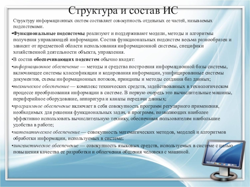 Структуру информационных систем составляет совокупность отдельных ее частей,