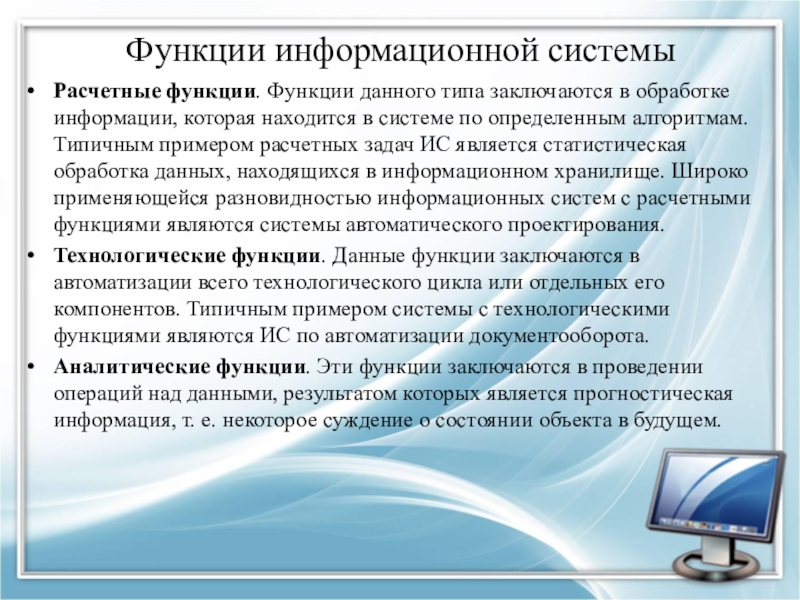 которая находится в системе по определенным алгоритмам. Типичным примером расчетных задач ИС является статистическая обработка данных, находящихся в информационном хранилище. Широко применяющейся разновидностью информационных систем с расчетными функциями являются системы автоматического проектирования.
