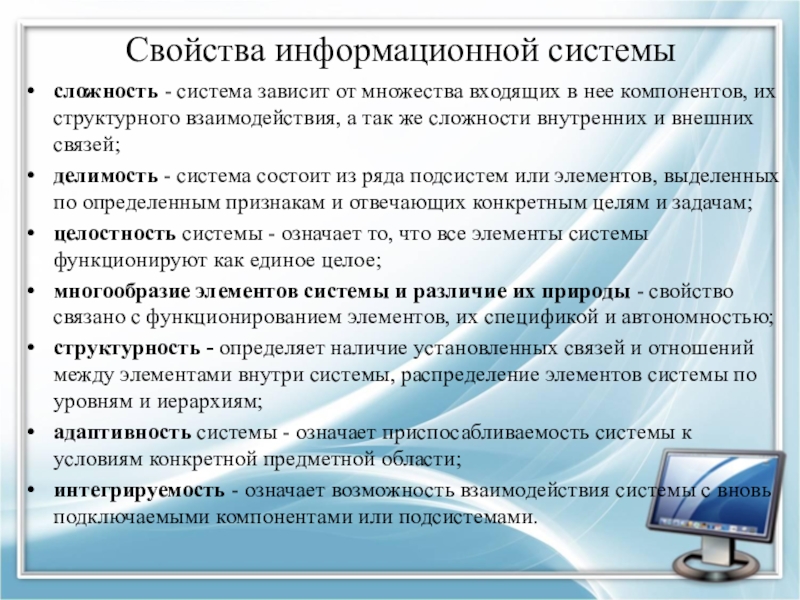 делимость - система состоит из ряда подсистем или элементов, выделенных по определенным признакам и отвечающих конкретным целям и задачам;