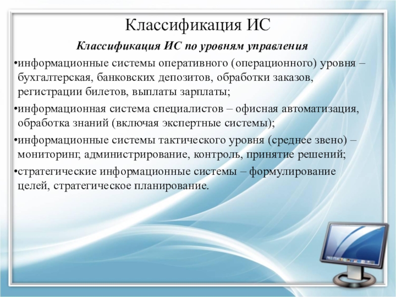 информационные системы тактического уровня (среднее звено) – мониторинг, администрирование, контроль, принятие решений;
