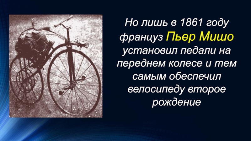 Слайд 17Но лишь в 1861 году француз Пьер Мишо установил педали на