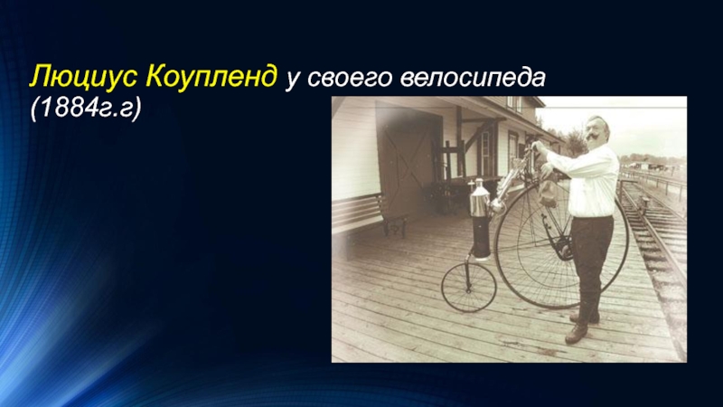 Слайд 18Люциус Коупленд у своего велосипеда (1884г.г)