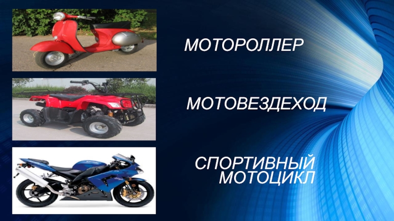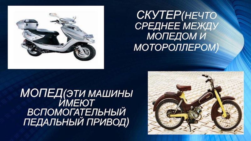 МОПЕД(ЭТИ МАШИНЫ ИМЕЮТ ВСПОМОГАТЕЛЬНЫЙ ПЕДАЛЬНЫЙ ПРИВОД) СКУТЕР(НЕЧТО СРЕДНЕЕ МЕЖДУ МОПЕДОМ И МОТОРОЛЛЕРОМ)