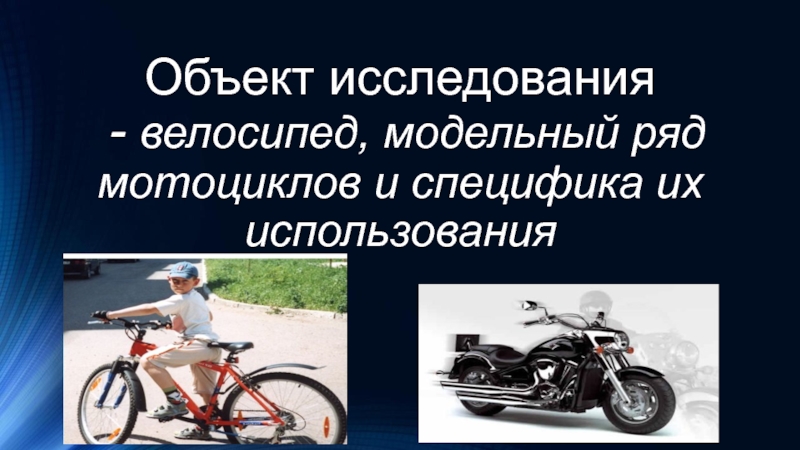 Слайд 3Объект исследования - велосипед, модельный ряд мотоциклов и специфика их использования