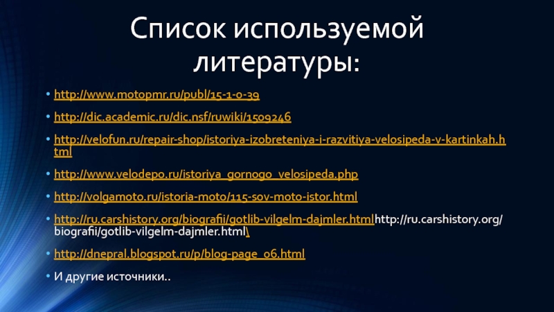 Список используемой литературы:http://www.motopmr.ru/publ/15-1-0-39http://dic.academic.ru/dic.nsf/ruwiki/1509246http://velofun.ru/repair-shop/istoriya-izobreteniya-i-razvitiya-velosipeda-v-kartinkah.htmlhttp://www.velodepo.ru/istoriya_gornogo_velosipeda.phphttp://volgamoto.ru/istoria-moto/115-sov-moto-istor.html http://ru.carshistory.org/biografii/gotlib-vilgelm-dajmler.htmlhttp://ru.carshistory.org/biografii/gotlib-vilgelm-dajmler.html\http://dnepral.blogspot.ru/p/blog-page_06.htmlИ другие источники..