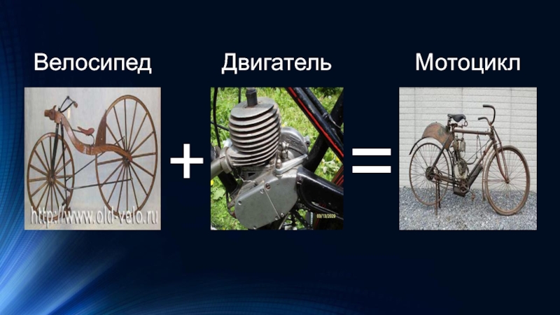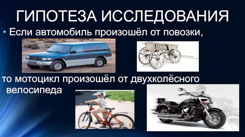 ГИПОТЕЗА ИССЛЕДОВАНИЯ Если автомобиль произошёл от повозки, то мотоцикл произошёл от двухколёсного велосипеда