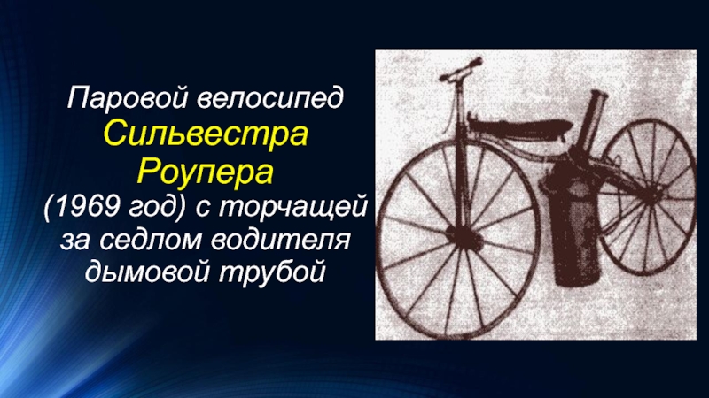 Слайд 14Паровой велосипед Сильвестра Роупера (1969 год) с торчащей за седлом водителя