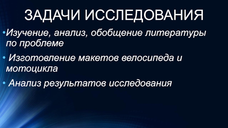 ЗАДАЧИ ИССЛЕДОВАНИЯИзучение, анализ, обобщение литературы по проблеме Изготовление макетов велосипеда и мотоцикла Анализ результатов исследования