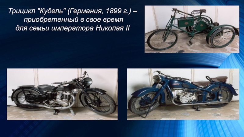 Слайд 19Трицикл "Кудель" (Германия, 1899 г.) – приобретенный в свое время для