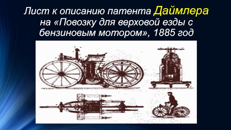 Слайд 12Лист к описанию патента Даймлера на «Повозку для верховой езды с